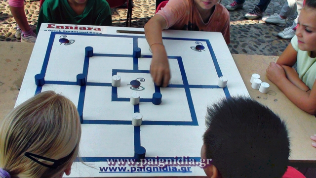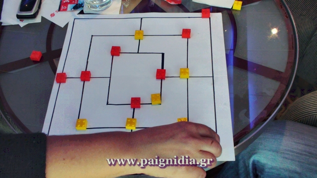 να σχηματίζονται τέσσερεις σταυροί, ένας σταυρός σε κάθε πλευρά του μεσαίου τετραγώνου. Ο κάθε παίχτης είχε από εννιά πετραδάκια - χαλίκια. Το